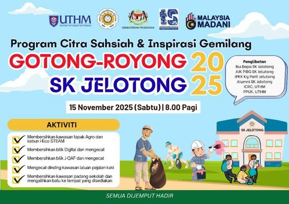 Aktiviti gotong-royong bersama komuniti: pembersihan, pengecatan dan keceriaan kawasan sekolah dengan penglibatan ibu bapa, PIBG, alumni, pihak sekolah dan UTHM